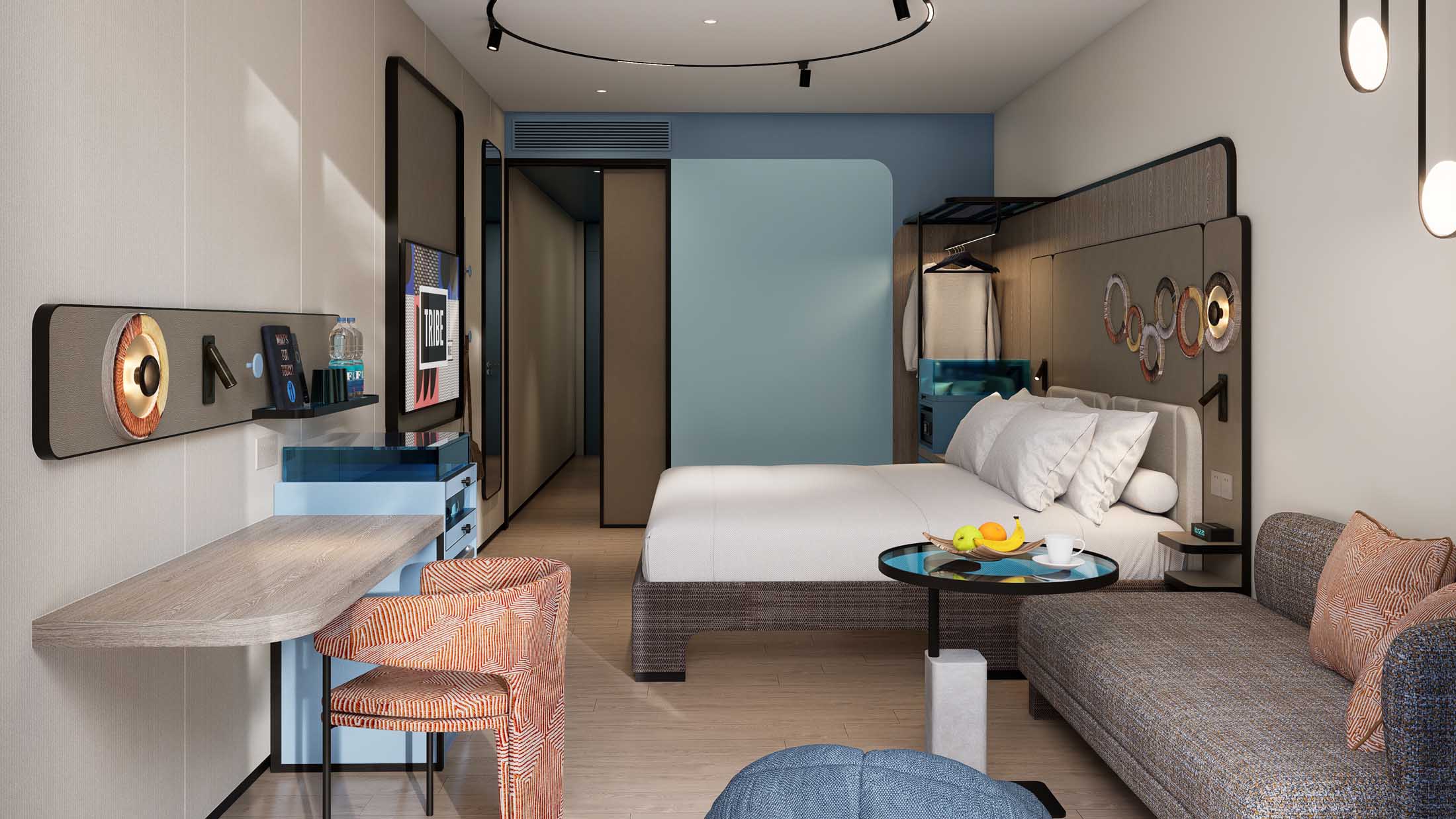 Our Twin Room offers 30 square meters of flexible, comfortable space ideal for friends, colleagues, or families seeking extra room. Featuring two double beds, a 55" TV, and a mini…